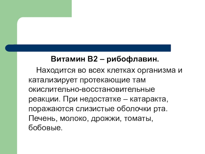 клетках организма и катализирует протекающие там окислительно-восстановительные реакции. При недостатке – катаракта, поражаются слизистые оболочки рта. Печень, молоко, дрожжи, томаты, бобовые.