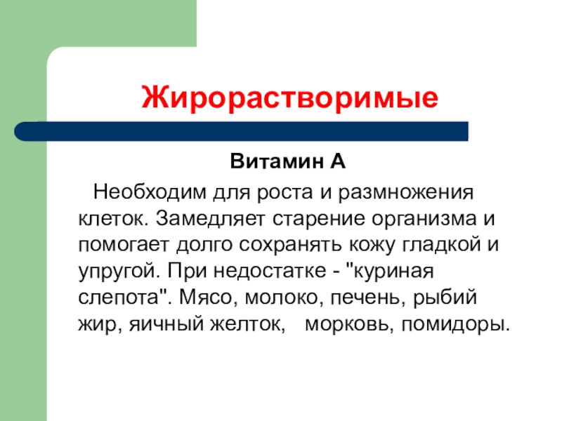 Замедляет старение организма и помогает долго сохранять кожу гладкой и упругой. При недостатке - "куриная слепота". Мясо, молоко, печень, рыбий жир, яичный желток, морковь, помидоры.