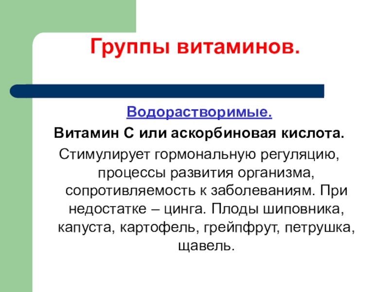организма, сопротивляемость к заболеваниям. При недостатке – цинга. Плоды шиповника, капуста, картофель, грейпфрут, петрушка, щавель.