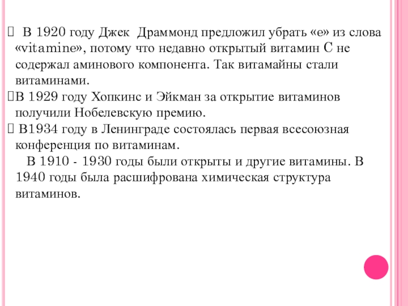 В 1910 - 1930 годы были открыты и другие витамины. В 1940 годы была расшифрована химическая структура витаминов.