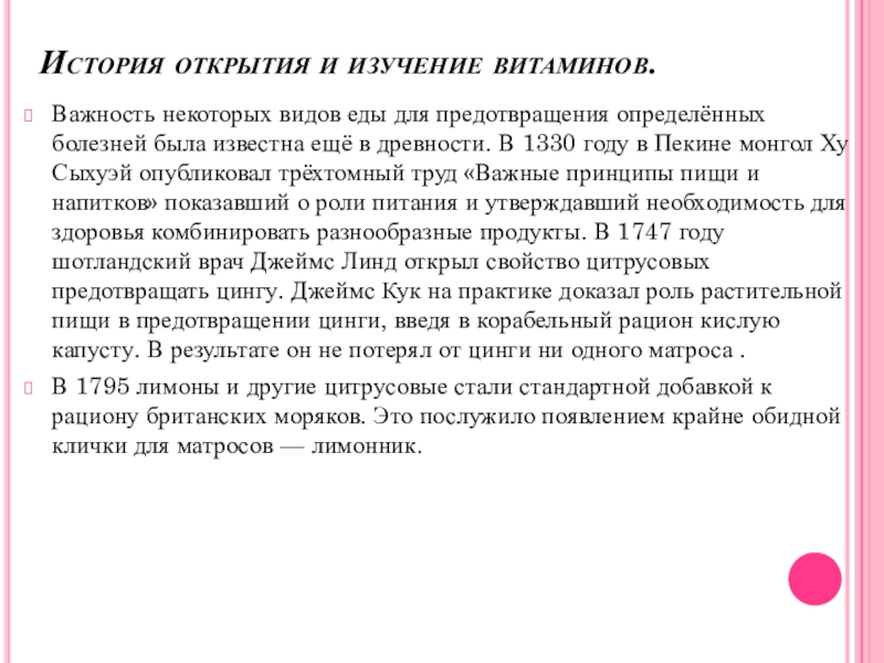 предотвращения определённых болезней была известна ещё в древности. В 1330 году в Пекине монгол Ху Сыхуэй опубликовал трёхтомный труд «Важные принципы пищи и напитков» показавший о роли питания и утверждавший необходимость для здоровья комбинировать разнообразные продукты. В 1747 году шотландский врач Джеймс Линд открыл свойство цитрусовых предотвращать цингу. Джеймс Кук на практике доказал роль растительной пищи в предотвращении цинги, введя в корабельный рацион кислую капусту. В результате он не потерял от цинги ни одного матроса .