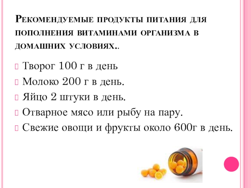 Слайд 16Рекомендуемые продукты питания для пополнения витаминами организма в домашних условиях..