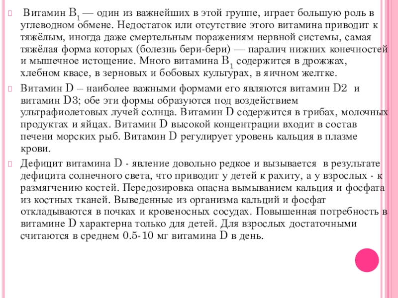 Витамин D – наиболее важными формами его являются витамин D2 и витамин D3; обе эти формы образуются под воздействием ультрафиолетовых лучей солнца. Витамин D содержится в грибах, молочных продуктах и яйцах. Витамин D высокой концентрации входит в состав печени морских рыб. Витамин D регулирует уровень кальция в плазме крови.