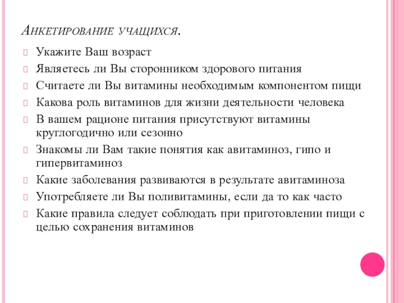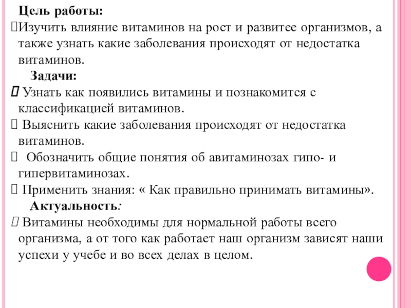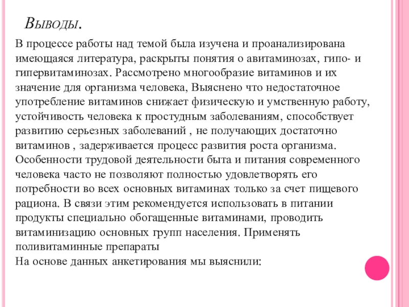 раскрыты понятия о авитаминозах, гипо- и гипервитаминозах. Рассмотрено многообразие витаминов и их значение для организма человека, Выяснено что недостаточное употребление витаминов снижает физическую и умственную работу, устойчивость человека к простудным заболеваниям, способствует развитию серьезных заболеваний , не получающих достаточно витаминов , задерживается процесс развития роста организма. Особенности трудовой деятельности быта и питания современного человека часто не позволяют полностью удовлетворять его потребности во всех основных витаминах только за счет пищевого рациона. В связи этим рекомендуется использовать в питании продукты специально обогащенные витаминами, проводить витаминизацию основных групп населения. Применять поливитаминные препараты