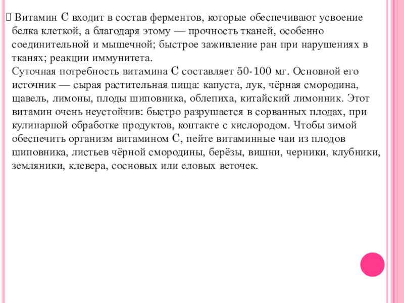 Слайд 9 Витамин C входит в состав ферментов, которые обеспечивают усвоение белка