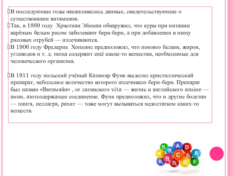 Слайд 5В последующие годы накапливались данные, свидетельствующие о существовании витаминов.