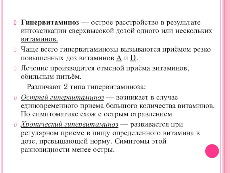 Острый гипервитаминоз — возникает в случае единовременного приема большого количества витаминов. По симптоматике схож с острым отравлением