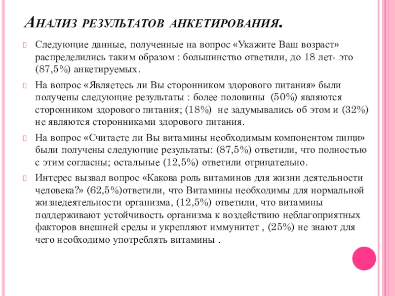На вопрос «Считаете ли Вы витамины необходимым компонентом пищи» были получены следующие результаты: (87,5%) ответили, что полностью с этим согласны; остальные (12,5%) ответили отрицательно.