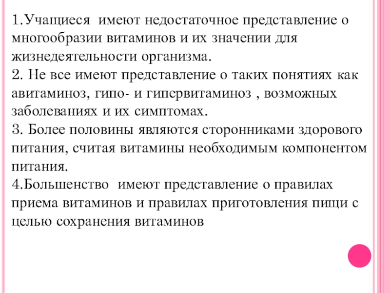 Слайд 221.Учащиеся имеют недостаточное представление о многообразии витаминов и их значении для