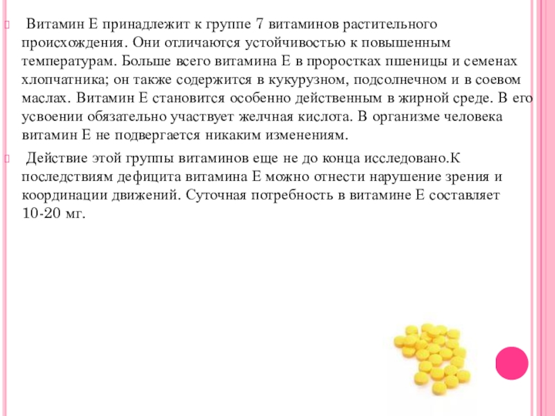 отличаются устойчивостью к повышенным температурам. Больше всего витамина Е в проростках пшеницы и семенах хлопчатника; он также содержится в кукурузном, подсолнечном и в соевом маслах. Витамин Е становится особенно действенным в жирной среде. В его усвоении обязательно участвует желчная кислота. В организме человека витамин Е не подвергается никаким изменениям.
