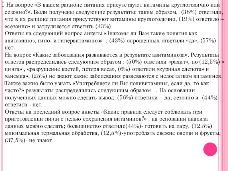 Ответы на последний вопрос анкеты «Какие правила следует соблюдать при приготовлении пищи с целью сохранения витаминов?» : на основании анализа данных можно сделать; большинство ответило(44%)- готовить на пару, (12.5%) минимальная термальная обработка, (12,5%)-употреблять свежие овощи и фрукты, (37,5%)- не знают.