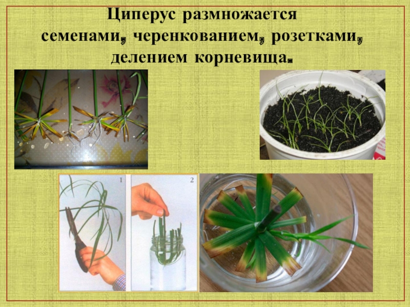 Циперус размножаетсясеменами, черенкованием, розетками, делением корневища.