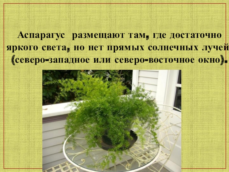 Слайд 21 Аспарагус размещают там, где достаточно яркого света, но нет прямых