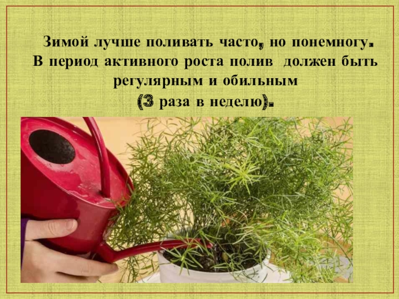 Слайд 23 Зимой лучше поливать часто, но понемногу. В период активного роста