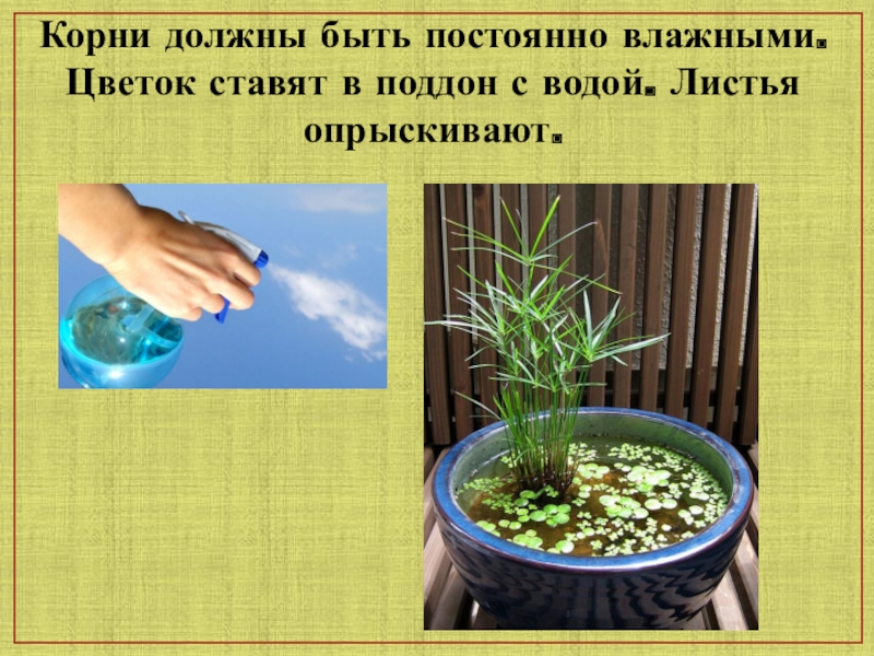 Слайд 11Корни должны быть постоянно влажными. Цветок ставят в поддон с водой.