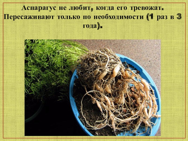 Слайд 25Аспарагус не любит, когда его тревожат. Пересаживают только по необходимости (1