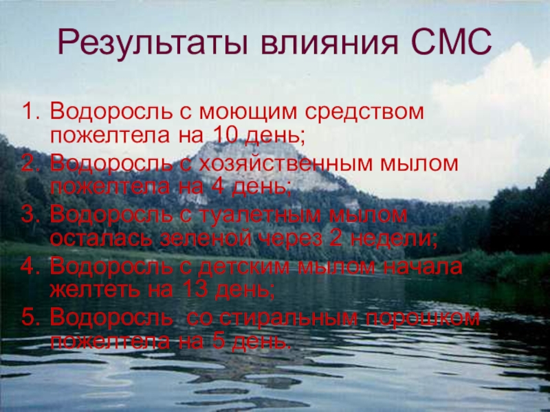 Результаты влияния СМСВодоросль с моющим средством пожелтела на 10 день;Водоросль с хозяйственным мылом пожелтела на 4 день;Водоросль