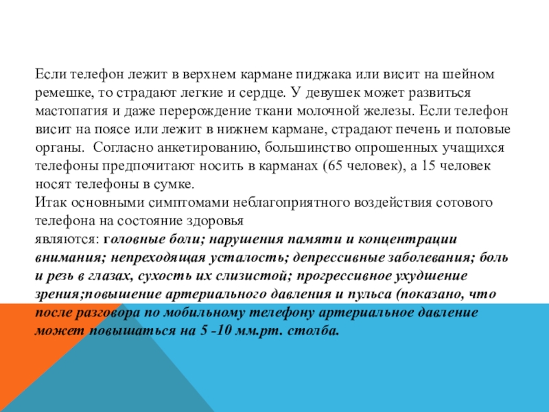 ремешке, то страдают легкие и сердце. У девушек может развиться мастопатия и даже перерождение ткани молочной железы. Если телефон висит на поясе или лежит в нижнем кармане, страдают печень и половые органы. Согласно анкетированию, большинство опрошенных учащихся телефоны предпочитают носить в карманах (65 человек), а 15 человек носят телефоны в сумке.
