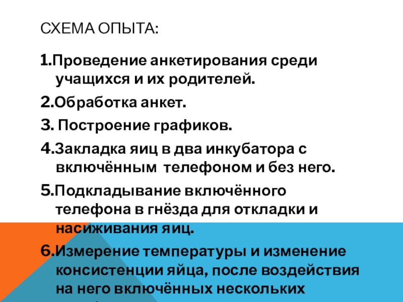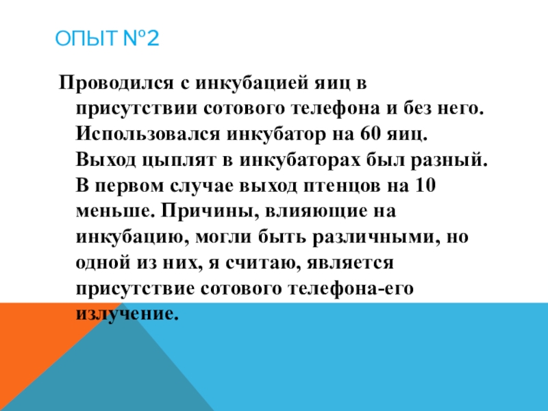 Опыт сводился к тому, что сотовый телефон подкладывала в гнездо под солому и вела подсчет количества яиц, снесенных 10 курами в день. Для сравнения подсчитывала яйца в гнезде, где сотового не было. Гнёзда были привычными для птиц. Из гнезд до эксперимента вынималось примерно одинаковое количество яиц, около 10, а после эксперимента 5-6 яиц, несколько кур даже не сели в гнездо и соответственно не снесли яиц.