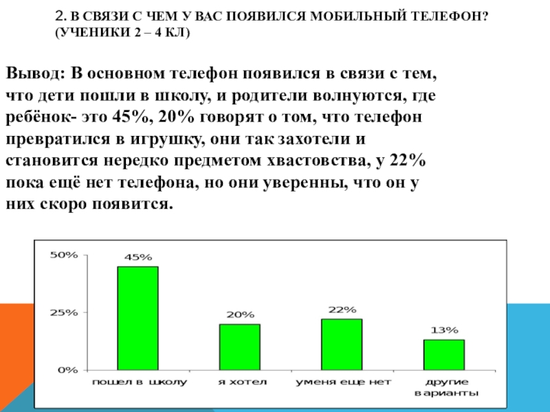 Вывод: В основном телефон появился в связи с тем, что дети пошли в школу, и родители волнуются, где ребёнок- это 45%, 20% говорят о том, что телефон превратился в игрушку, они так захотели и становится нередко предметом хвастовства, у 22% пока ещё нет телефона, но они уверенны, что он у них скоро появится.