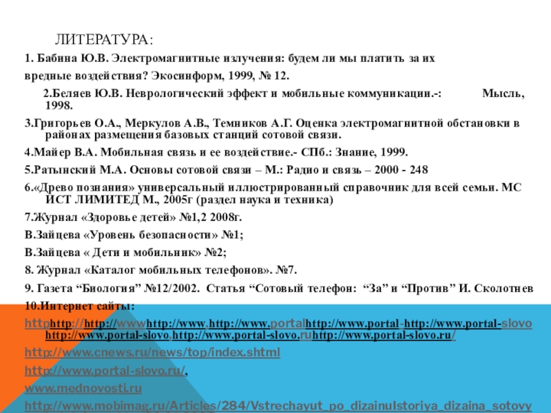2.Беляев Ю.В. Неврологический эффект и мобильные коммуникации.-: Мысль, 1998.