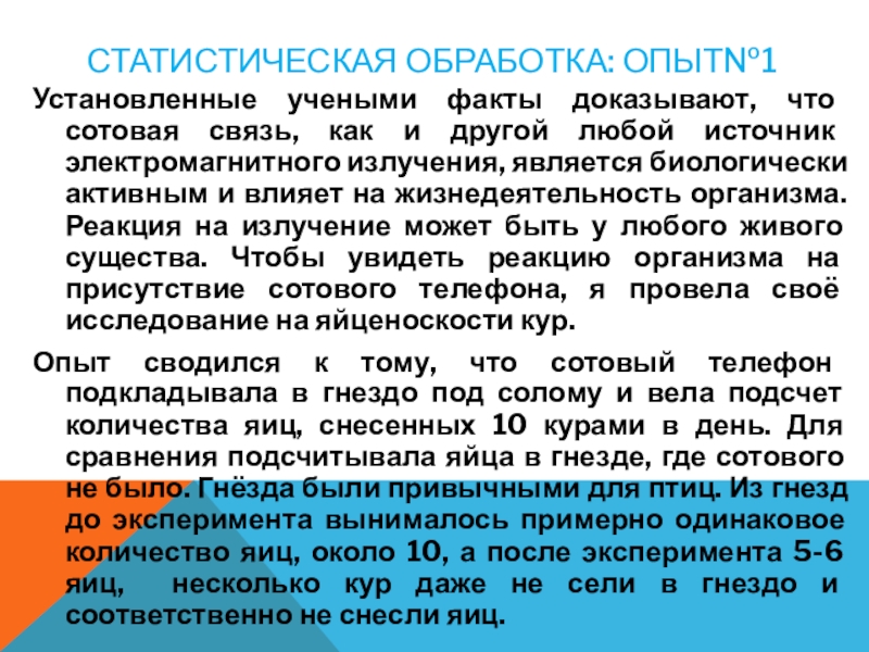 Слайд 10СТАТИСТИЧЕСКАЯ ОБРАБОТКА: ОПЫТ№1