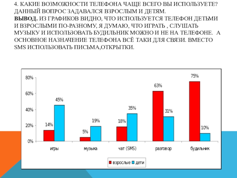 ВЫВОД. ИЗ ГРАФИКОВ ВИДНО, ЧТО ИСПОЛЬЗУЕТСЯ ТЕЛЕФОН ДЕТЬМИ И ВЗРОСЛЫМИ ПО-РАЗНОМУ, Я ДУМАЮ, ЧТО ИГРАТЬ , СЛУШАТЬ МУЗЫКУ И ИСПОЛЬЗОВАТЬ БУДИЛЬНИК МОЖНО И НЕ НА ТЕЛЕФОНЕ. А ОСНОВНОЕ НАЗНАЧЕНИЕ ТЕЛЕФОНА ВСЁ ТАКИ ДЛЯ СВЯЗИ. ВМЕСТО SMS ИСПОЛЬЗОВАТЬ ПИСЬМА,ОТКРЫТКИ.