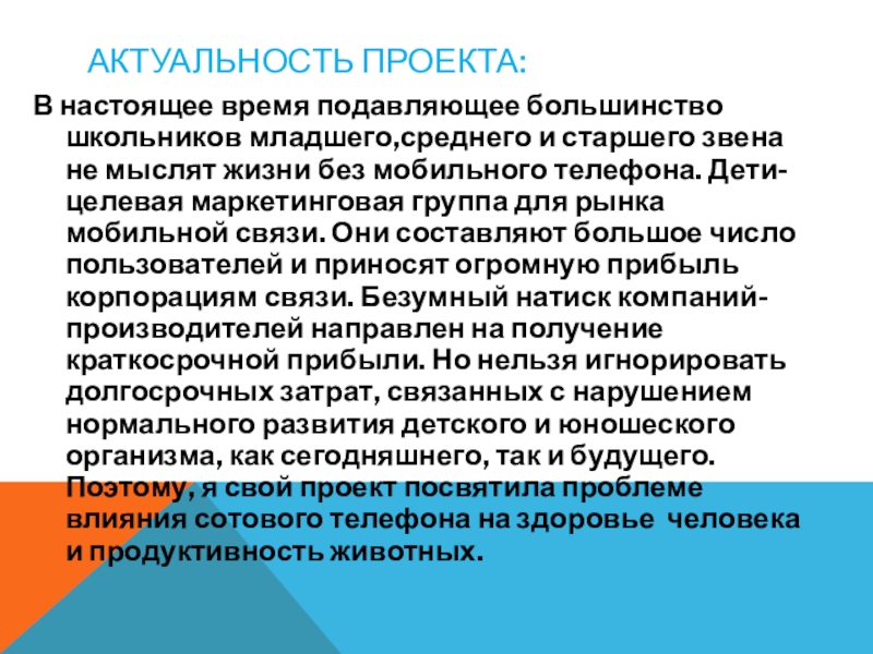 не мыслят жизни без мобильного телефона. Дети- целевая маркетинговая группа для рынка мобильной связи. Они составляют большое число пользователей и приносят огромную прибыль корпорациям связи. Безумный натиск компаний-производителей направлен на получение краткосрочной прибыли. Но нельзя игнорировать долгосрочных затрат, связанных с нарушением нормального развития детского и юношеского организма, как сегодняшнего, так и будущего. Поэтому, я свой проект посвятила проблеме влияния сотового телефона на здоровье человека и продуктивность животных.