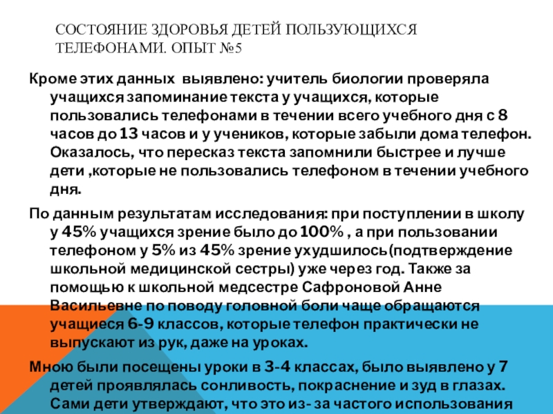 По данным результатам исследования: при поступлении в школу у 45% учащихся зрение было до 100% , а при пользовании телефоном у 5% из 45% зрение ухудшилось(подтверждение школьной медицинской сестры) уже через год. Также за помощью к школьной медсестре Сафроновой Анне Васильевне по поводу головной боли чаще обращаются учащиеся 6-9 классов, которые телефон практически не выпускают из рук, даже на уроках.