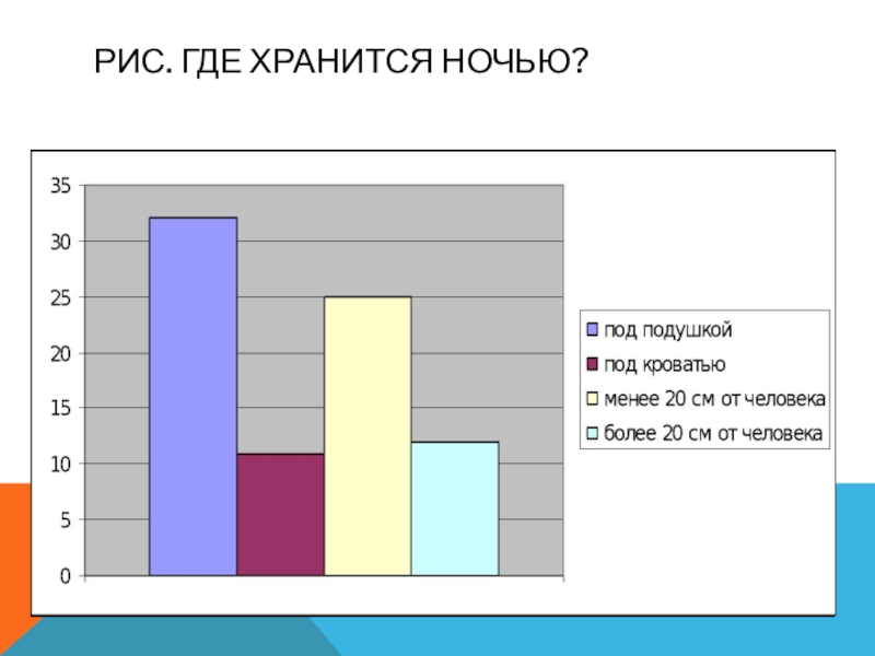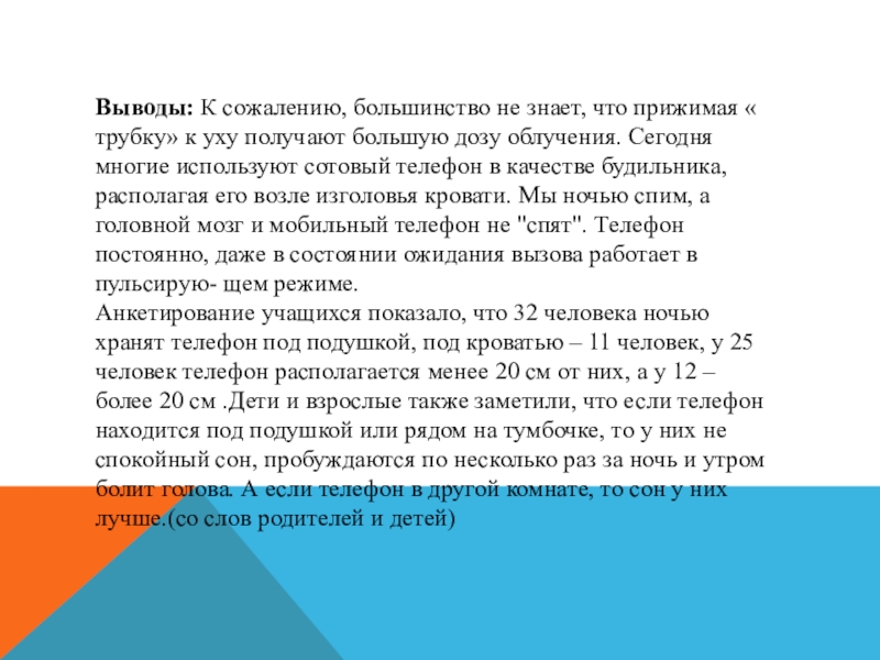 Анкетирование учащихся показало, что 32 человека ночью хранят телефон под подушкой, под кроватью – 11 человек, у 25 человек телефон располагается менее 20 см от них, а у 12 – более 20 см .Дети и взрослые также заметили, что если телефон находится под подушкой или рядом на тумбочке, то у них не спокойный сон, пробуждаются по несколько раз за ночь и утром болит голова. А если телефон в другой комнате, то сон у них лучше.(со слов родителей и детей)