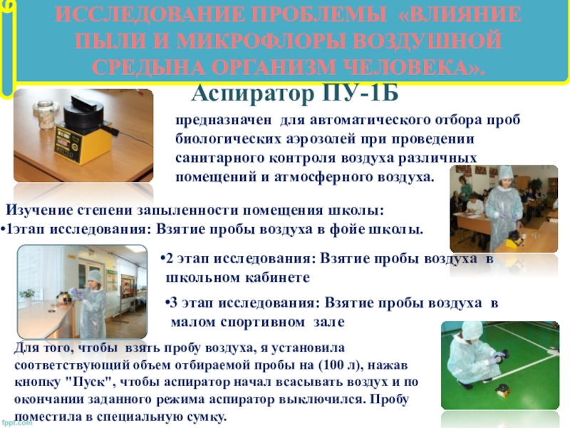 Для того, чтобы взять пробу воздуха, я установила соответствующий объем отбираемой пробы на (100 л), нажав кнопку "Пуск", чтобы аспиратор начал всасывать воздух и по окончании заданного режима аспиратор выключился. Пробу поместила в специальную сумку.