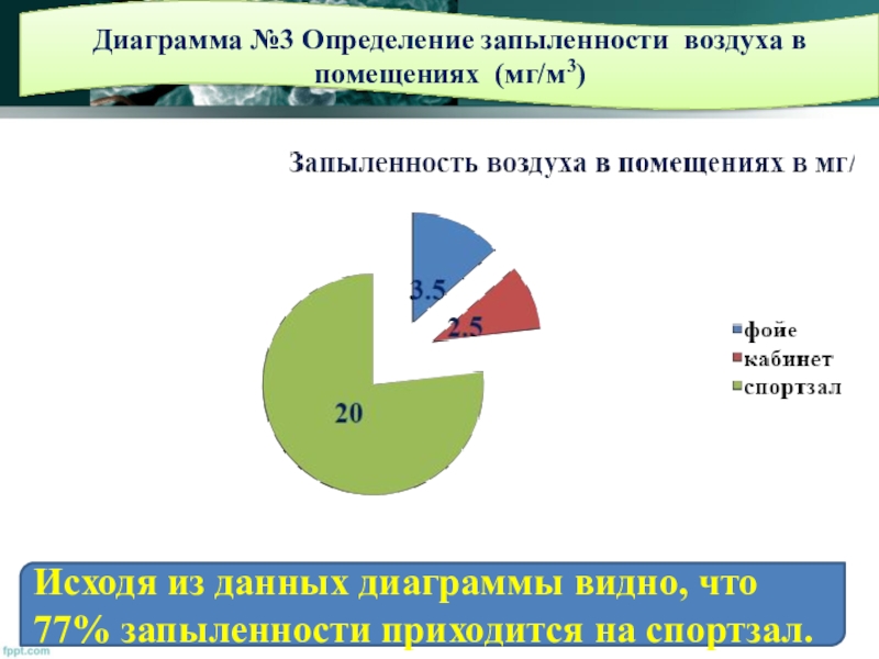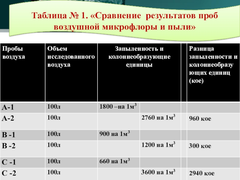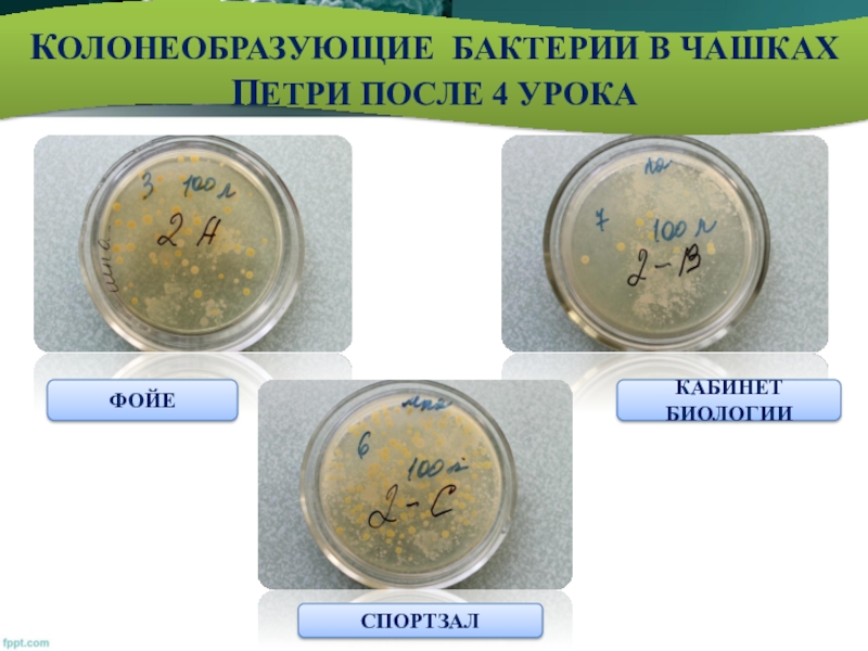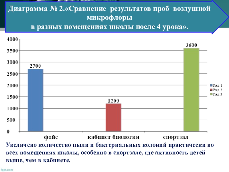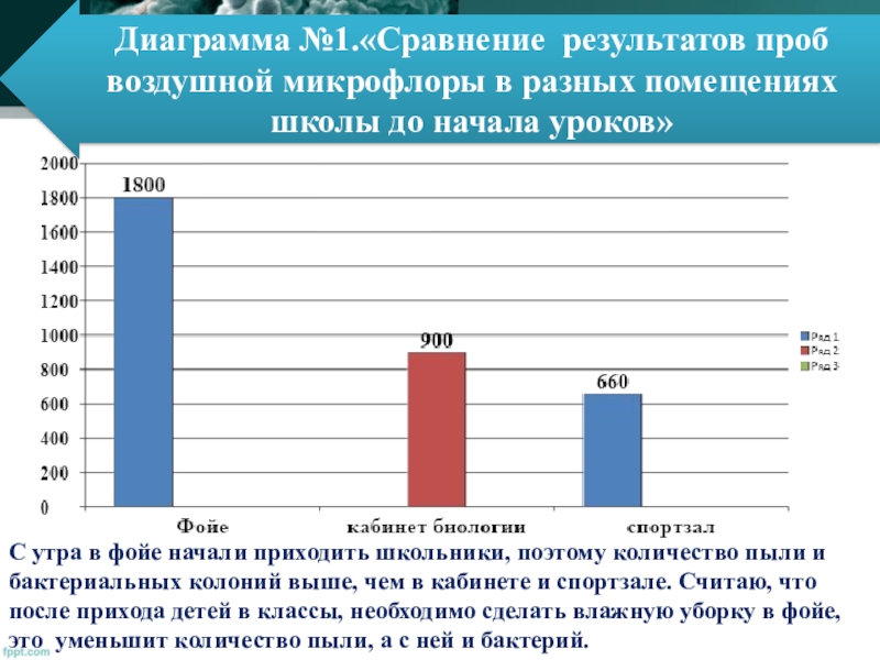С утра в фойе начали приходить школьники, поэтому количество пыли и бактериальных колоний выше, чем в кабинете и спортзале. Считаю, что после прихода детей в классы, необходимо сделать влажную уборку в фойе, это уменьшит количество пыли, а с ней и бактерий.