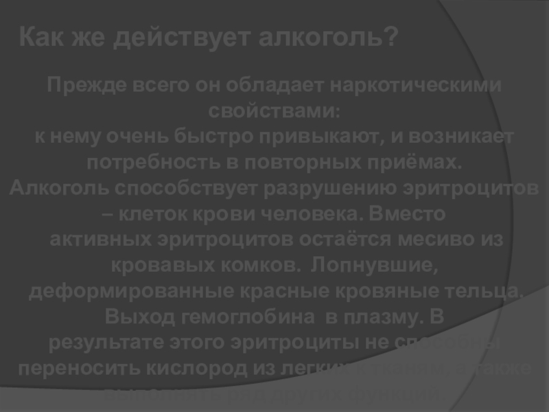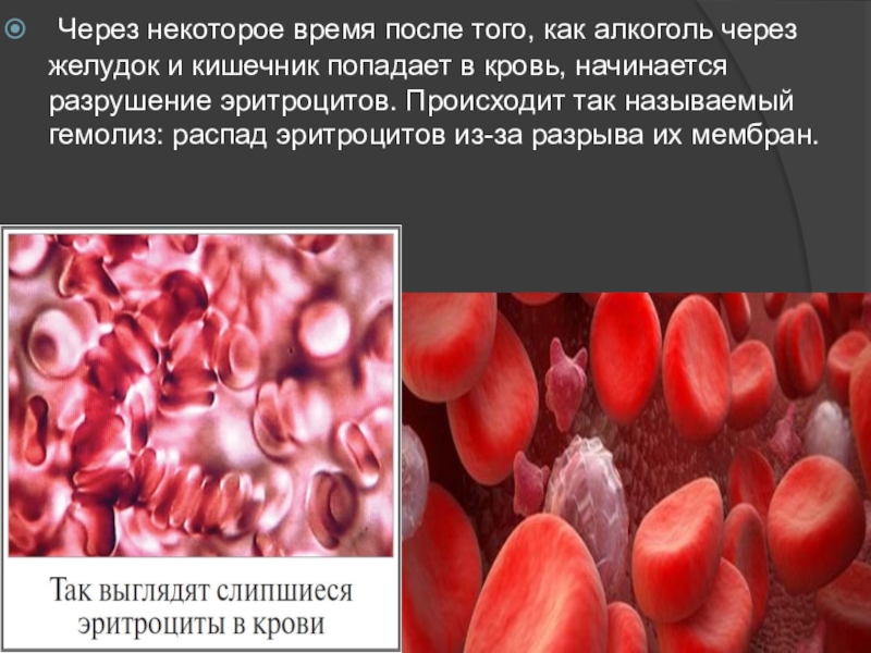 Алкоголь способствует разрушению эритроцитов – клеток крови человека. Вместо