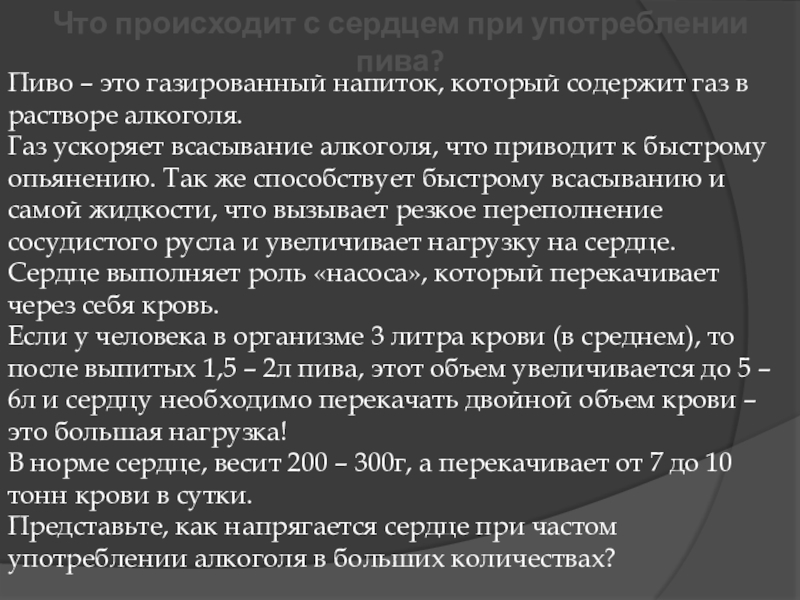 Если у человека в организме 3 литра крови (в среднем), то после выпитых 1,5 – 2л пива, этот объем увеличивается до 5 – 6л и сердцу необходимо перекачать двойной объем крови – это большая нагрузка!