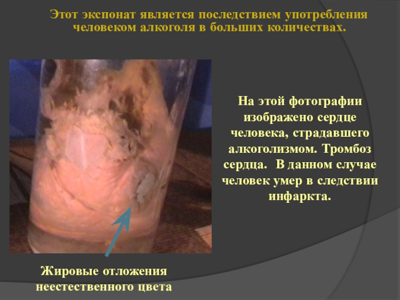 Слайд 7 Этот экспонат является последствием употребления человеком алкоголя в больших