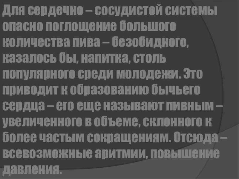 Слайд 10Для сердечно – сосудистой системы опасно поглощение большого количества пива –