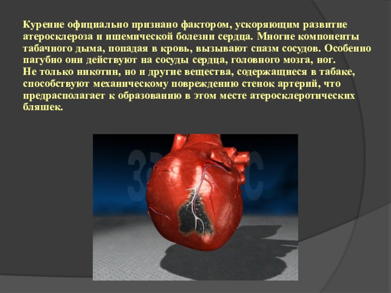 Слайд 5Курение официально признано фактором, ускоряющим развитие атеросклероза и ишемической болезни сердца.
