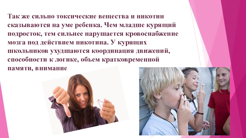 Слайд 12Так же сильно токсические вещества и никотин сказываются на уме ребенка.