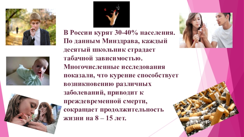 Слайд 5В России курят 30-40% населения. По данным Минздрава, каждый десятый школьник
