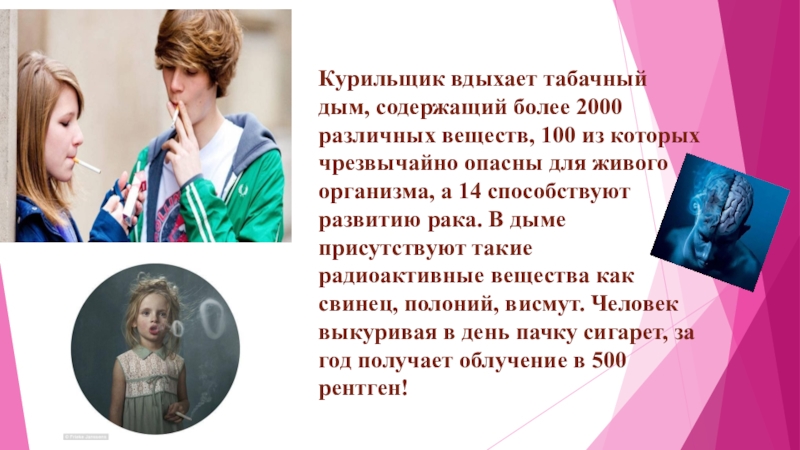 которых чрезвычайно опасны для живого организма, а 14 способствуют развитию рака. В дыме присутствуют такие радиоактивные вещества как свинец, полоний, висмут. Человек выкуривая в день пачку сигарет, за год получает облучение в 500 рентген!