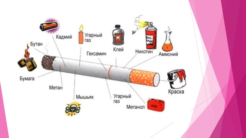 Слайд 8Курильщик вдыхает табачный дым, содержащий более 2000 различных веществ, 100 из