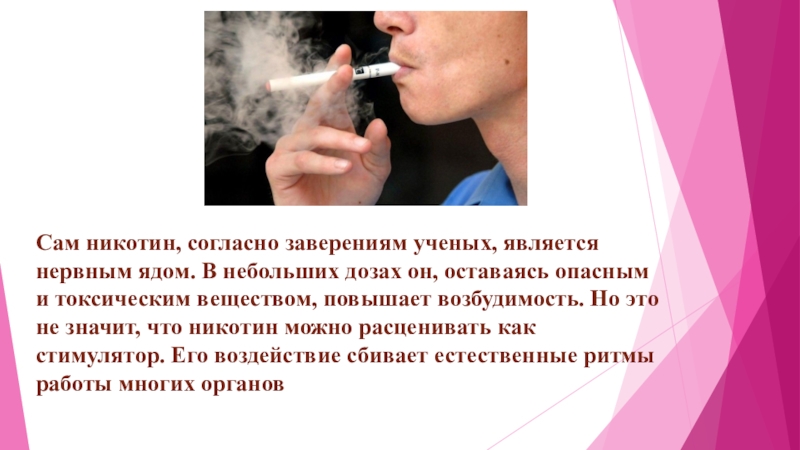 Слайд 15Сам никотин, согласно заверениям ученых, является нервным ядом. В небольших дозах