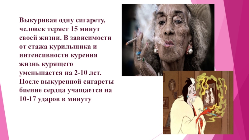 Слайд 7Выкуривая одну сигарету, человек теряет 15 минут своей жизни. В зависимости