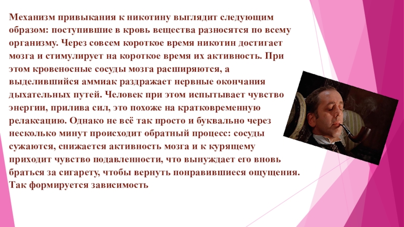 Слайд 16Механизм привыкания к никотину выглядит следующим образом: поступившие в кровь вещества