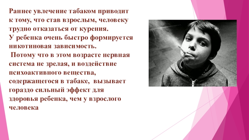 Слайд 14Раннее увлечение табаком приводит к тому, что став взрослым, человеку трудно