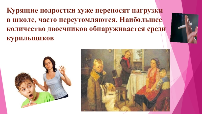 Слайд 13Курящие подростки хуже переносят нагрузки в школе, часто переутомляются. Наибольшее количество
