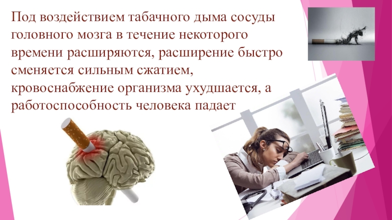 Слайд 9Под воздействием табачного дыма сосуды головного мозга в течение некоторого времени