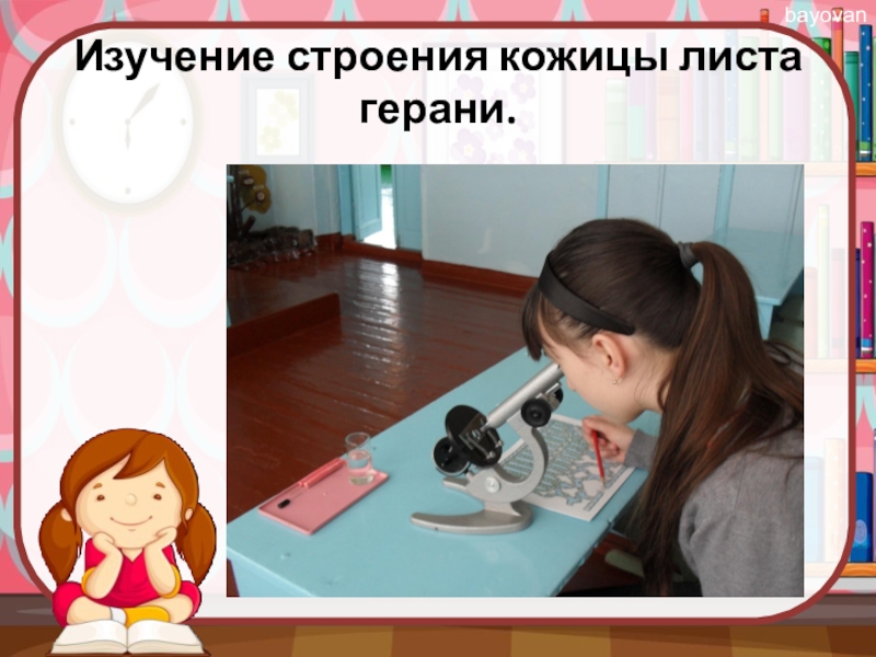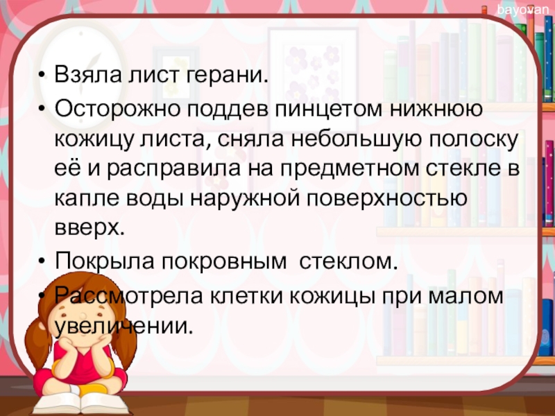 Оборудование: лист герани, пинцет, предметное стекло, покровное стекло,