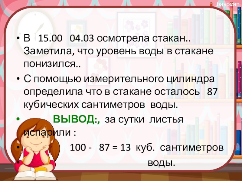 Слайд 23В 15.00 04.03 осмотрела стакан.. Заметила, что уровень воды