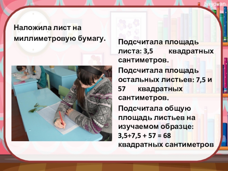 Подсчитала общую площадь листьев на изучаемом образце: 3,5+7,5 + 57 = 68 квадратных сантиметров